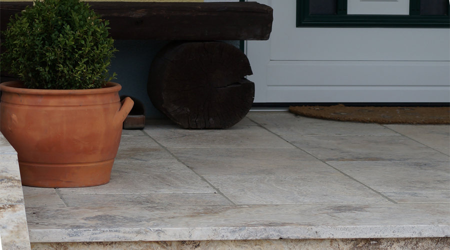 Verlegen von Bodenfliesen, Natursteinplatten, Innen- und Außentreppen aus Naturstein/Fliesen, im Dünn- und Dickbettverfahren.